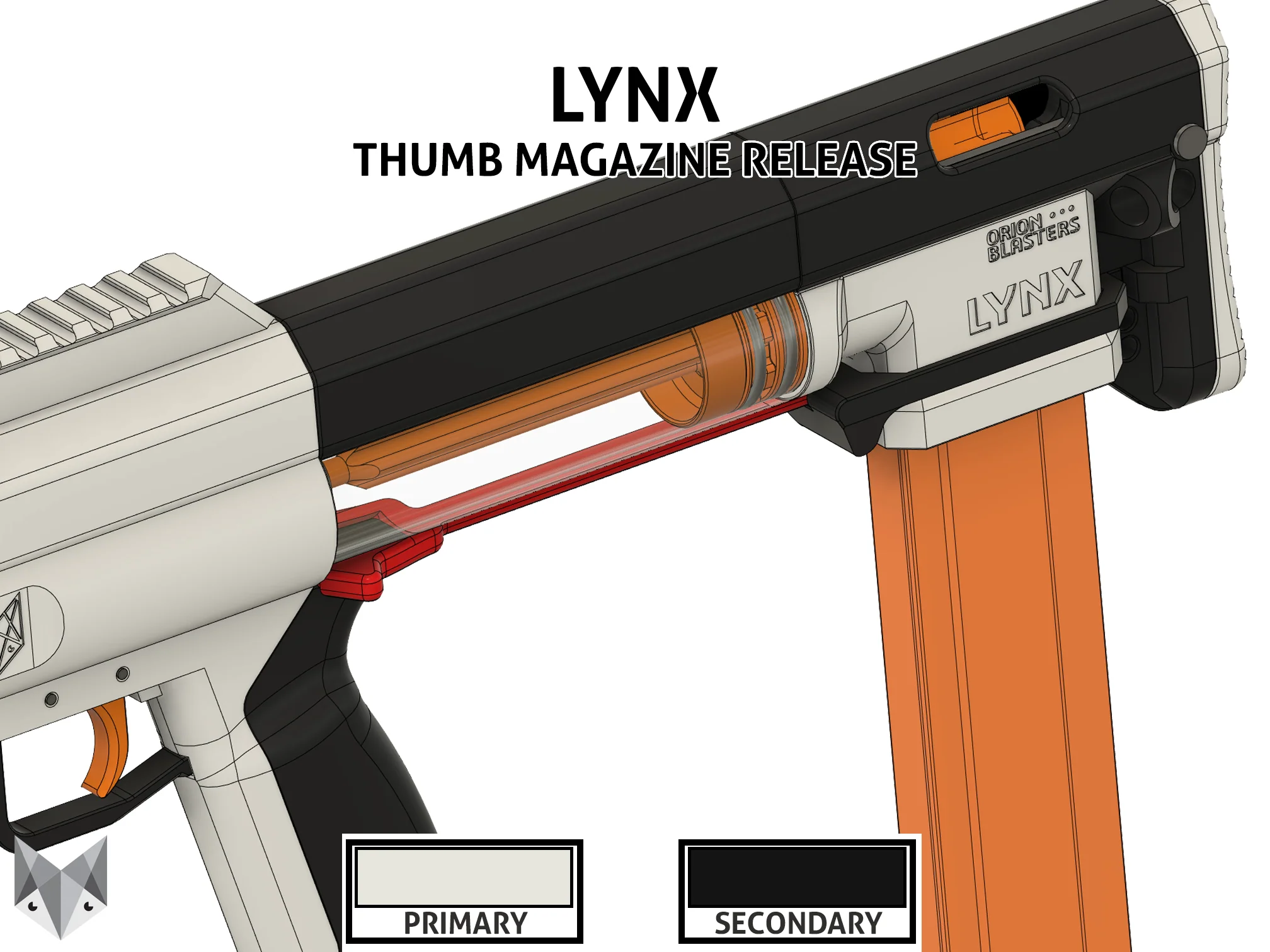 The Lynx is a Bullpup Mag-Fed Pump-Action Homemade Blaster for half length darts. The design was released as an Open Source Non-Commercial license file set by Orion Blasters. It features closed bolt mag swaps, slam-fire, is compatible with all longshot and talon claw springs, and can be completely disassembled without tools. Optional Thumb Magazine Release also available.